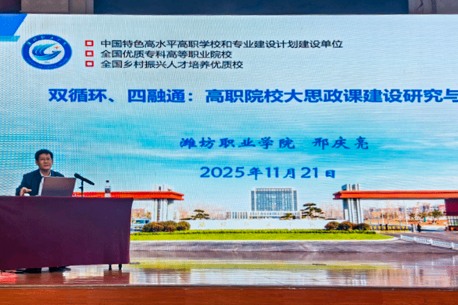 本次年会由山东省老教授协会、山东省高职高专院校思政课建设联盟主办,山东电子职业技术学院承办。年会内容丰富,涵盖了专家报告、经验交流、思政课示范展示以及专业群课程思政研课等多个环节,旨在共同探讨思政课程与课程思政的改革创新路径,携手绘制“大思政课”育人新蓝图。期间召开了山东省高职高专院校思政课建设联盟理事会。在经验交流环节,5位马克思主义学院院长及骨干教师代表就大思政课建设及中高职思政课一体化改革创新作了典型发言。我院马克思主义学院邢庆亮教授以《双循环、四融通:高职院校大思政课建设研究与实践》为题进行了汇报交流,得到与会专家教师高度评价。